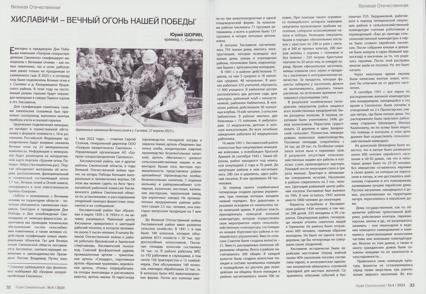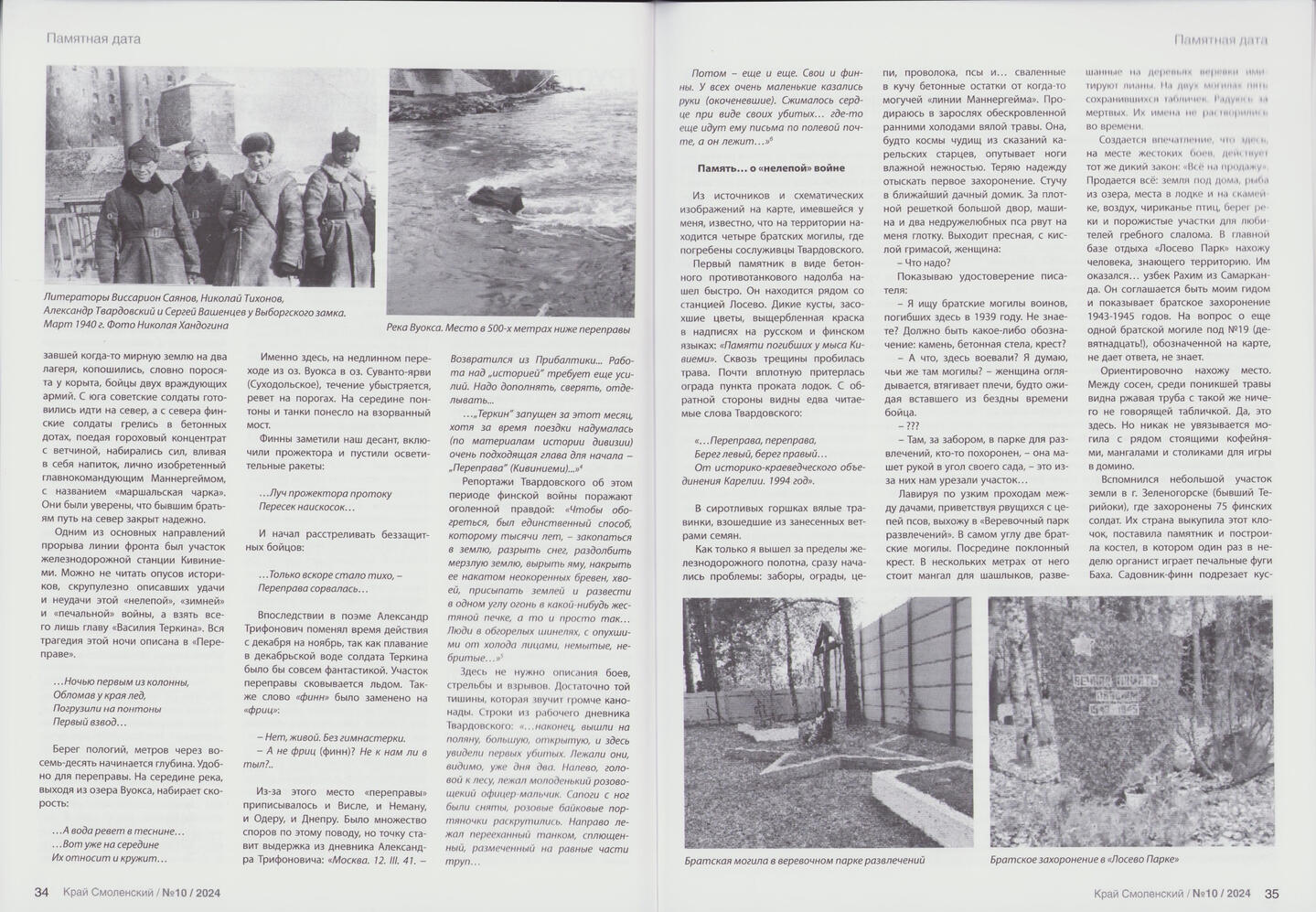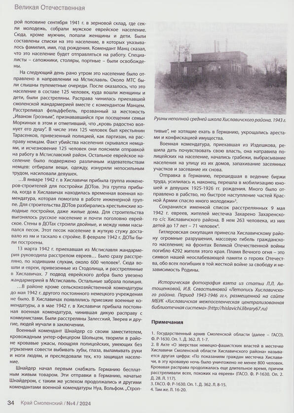 Журнал "Край Смоленский", основанный в 1991 году, является ценным источником информации для изучения истории Великой Отечественной войны на смоленской земле. На его страницах запечатлены трагические события оккупации, героизм советских воинов и партизан, а также мужество и стойкость мирного населения. Раздел "Эхо войны: голоса из архива журнала "Край Смоленский"" призван актуализировать и систематизировать наиболее значимые статьи, опубликованные в журнале за период с 2022 по 2024 гг. Представленные материалы, основанные на архивных документах, воспоминаниях очевидцев и результатах научных исследований, служат сохранению исторической памяти о Великой Отечественной войне и способствуют углубленному пониманию событий тех лет.